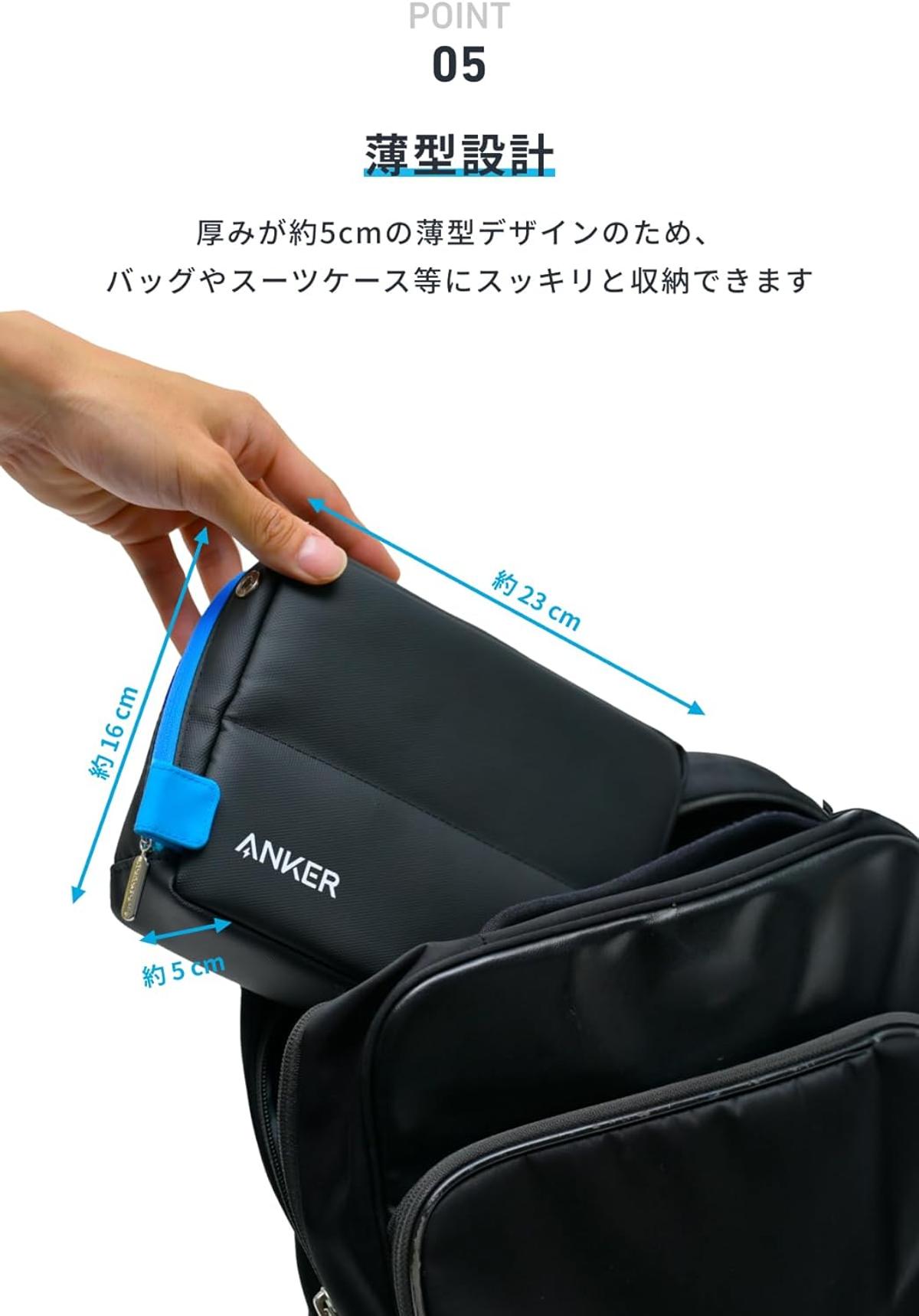 複数ポケットや内部の仕切りで、USB充電器やケーブル、バッテリーなどを無駄なくピッタリ収納できるデザインに。とくにAnker製品には最適化されています。