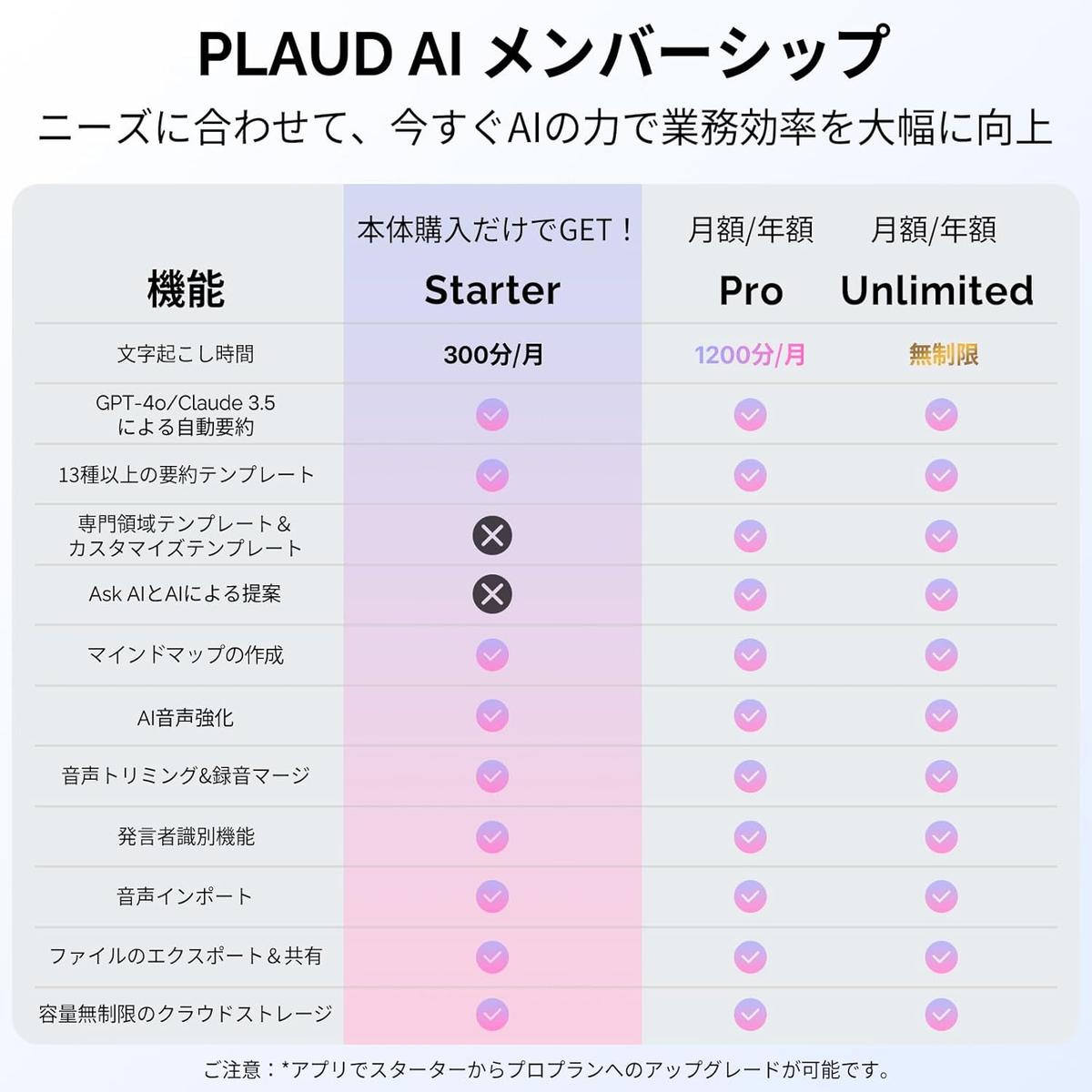 64GBのローカルストレージと無制限のクラウドストレージに加えて、無料の高度AIスタータープランでは毎月5時間までの文字起こしに対応。費用を抑えてたくさん作業ができて使い勝手抜群です。