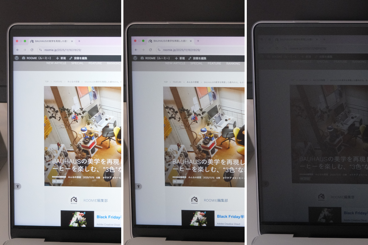 こちらは明るさをMAXにした状態です。横から見ると、画面全体は見えませんが端はわりとしっかり見えます。