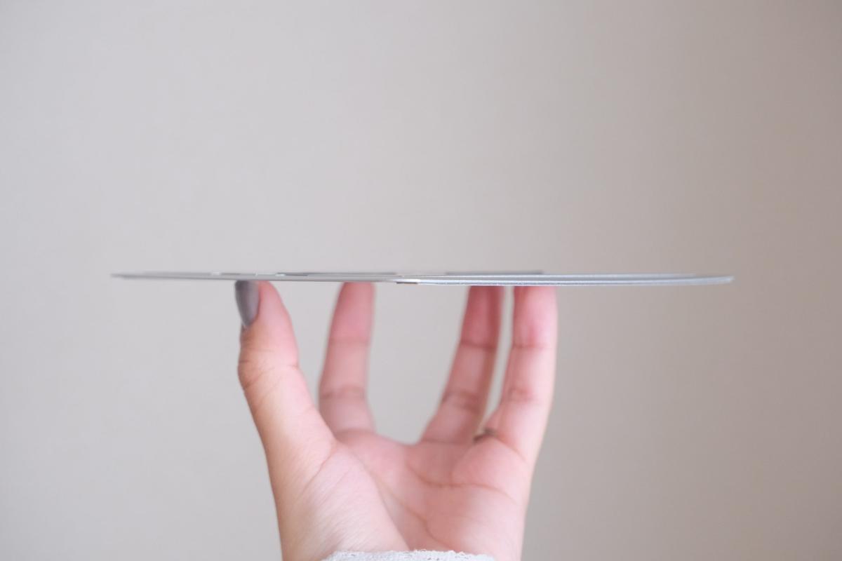 評判通りの薄さ(1.7mm)にはびっくり。ハードケース底面についている丸い滑り止めよりも薄いから、平置きしているとデスクに接触していません。