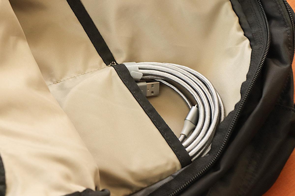 マジックテープで留められるので、ケーブル長くてもかさばりすぎずに持ち運べます。