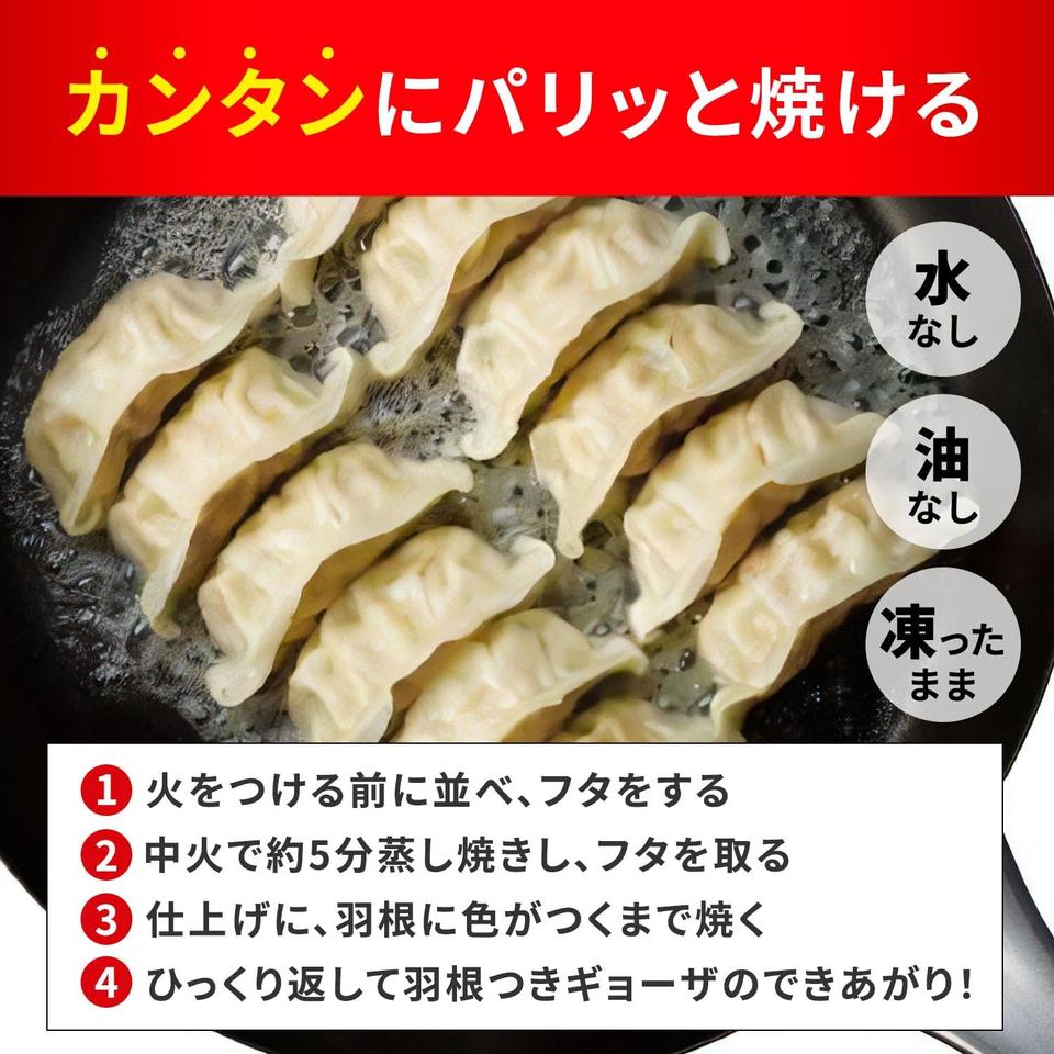 調理のハードルが低い点も魅力。画像にもあるように、水なし・油なしで中火5分の蒸し焼き後、焼き目をつけるだけで羽根つき餃子が完成。味の素ギョーザでおなじみの“失敗しない焼き上がり”をそのまま踏襲しています。