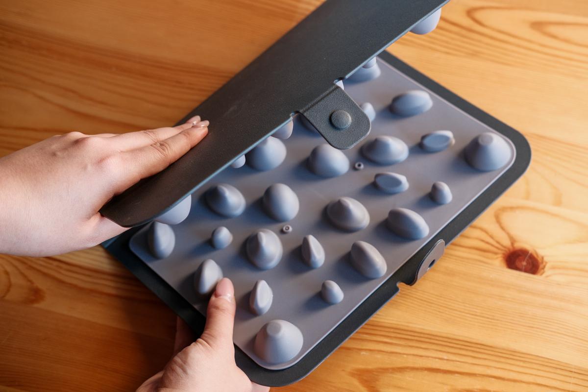 ファイルのような形状で、開くと大小さまざまなツボ押しが配置されています。