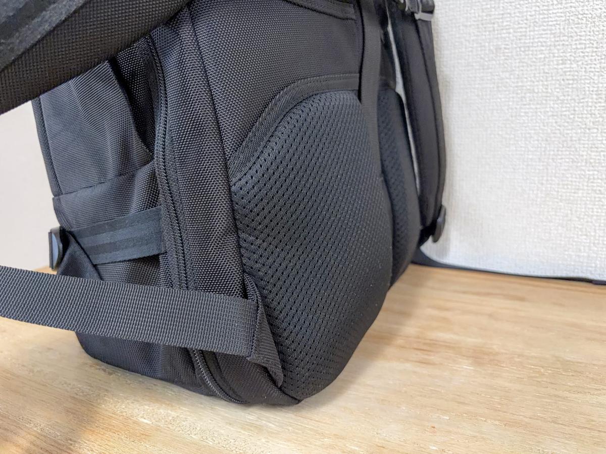 両肩が後ろに引っ張られている感覚が少なく、クッション構造とストラップの組み合わせが、体への負担をほどよく逃がしてくれるのだと思います。個人的には、この価格帯でここまでしっかりしたクッションを採用しているリュックは珍しいのでは、と思っています。