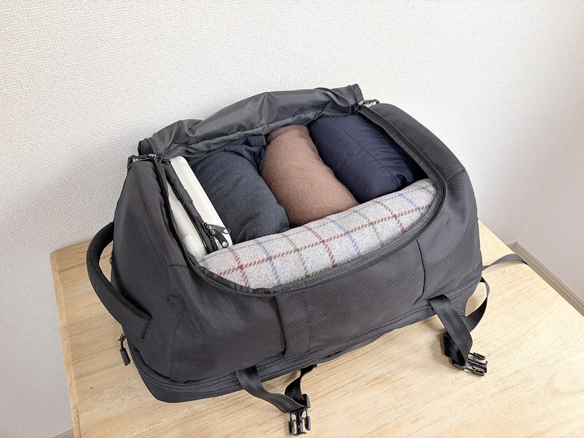 スーツケースのように全体を見渡せるので、私のような荷造りが苦手な人でも整理しやすい作りです。