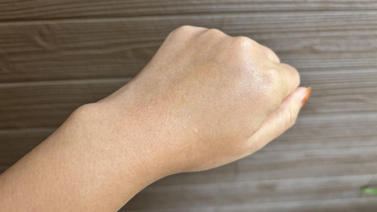 塗布直後はこんな感じ。ミストがかなり細かいので、わざわざ肌に馴染ませなくてもキレイに仕上がります。