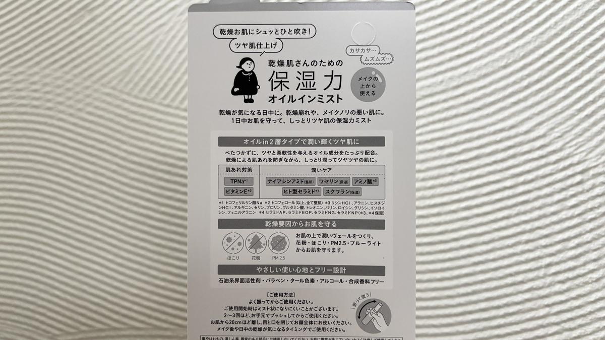 少しでもこの肌の乾燥をどうにかしたいと、乾燥さんの「保湿力オイルインミスト」を取り入れてみました。