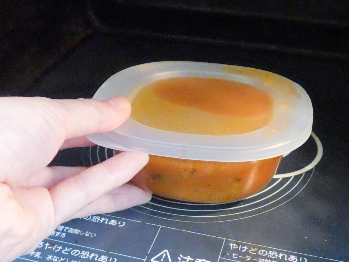ミネストローネの残りを冷蔵庫から取り出して、そのままレンジへ。