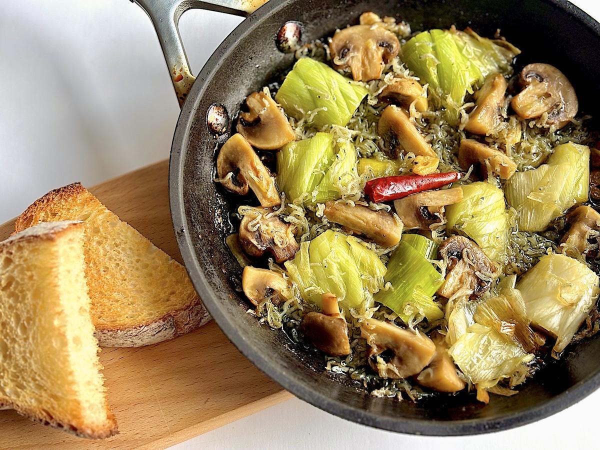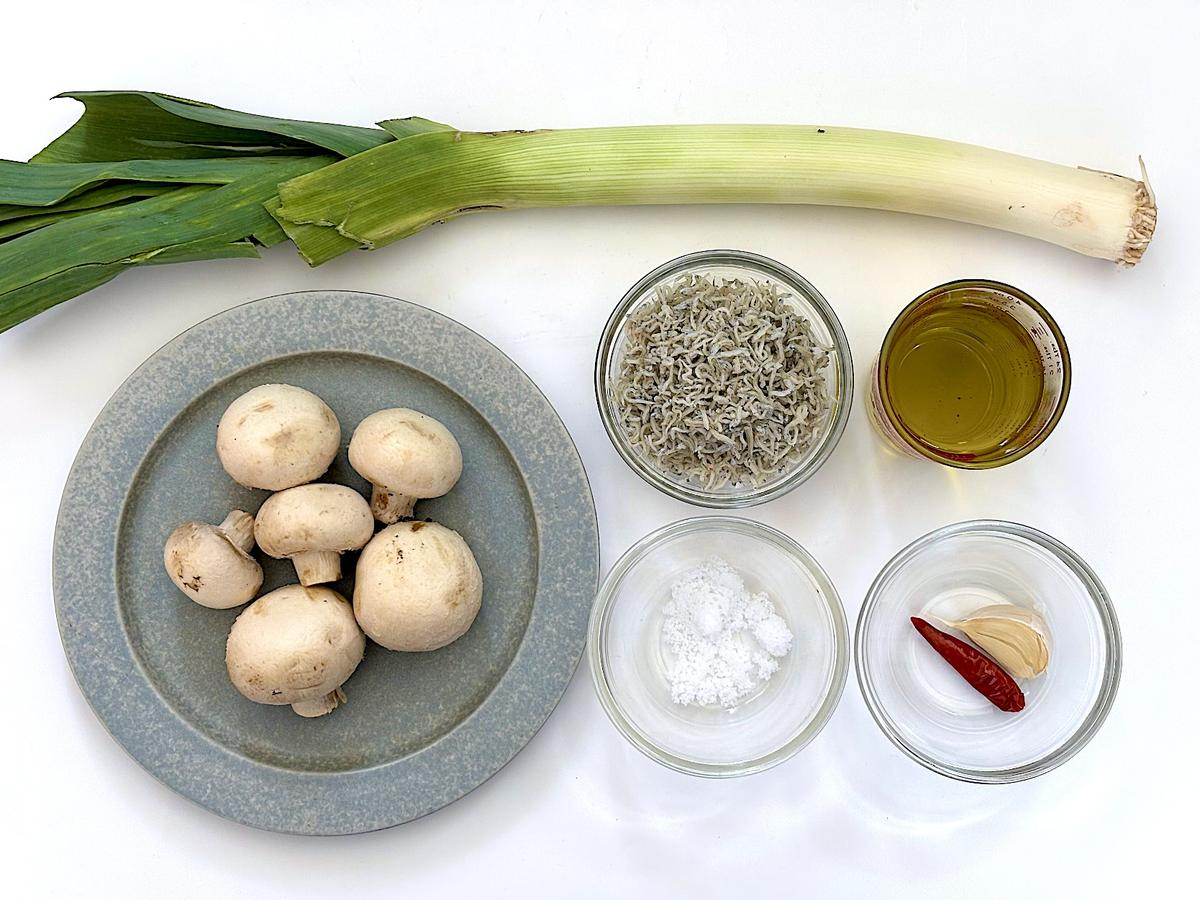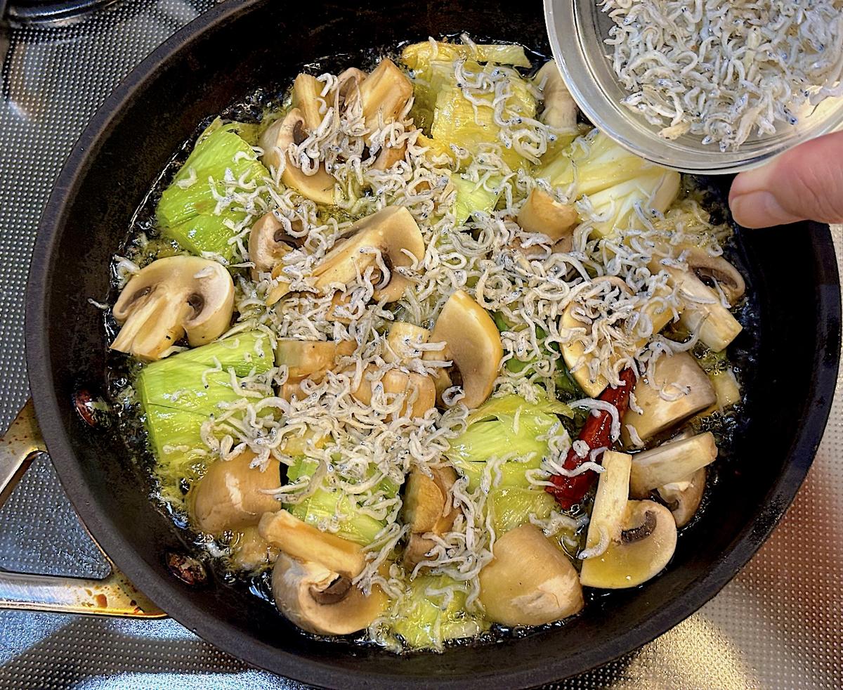4. オイルがふつふつとしてにんにくの香りが出てきたら、長ねぎとマッシュルーム、ちりめんじゃこを加える。長ねぎが柔らかくなるまで煮る。