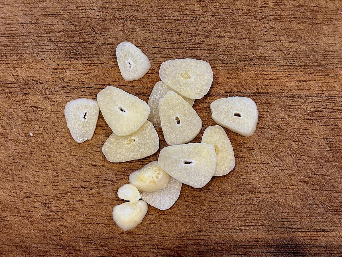 1. にんにくはスライスする。マッシュルームは4等分に。