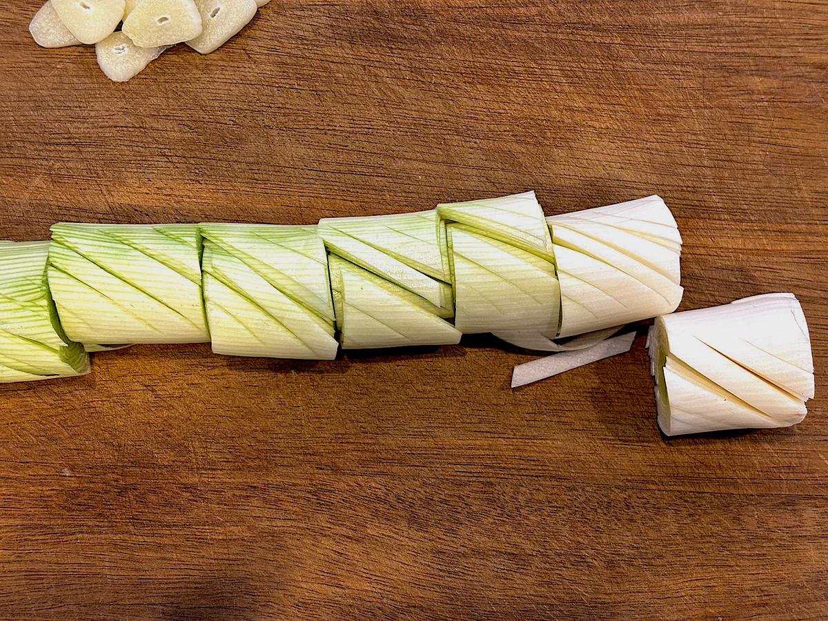 2. 長ねぎは斜めに切り込みを入れてから、3cm幅位にカットする。