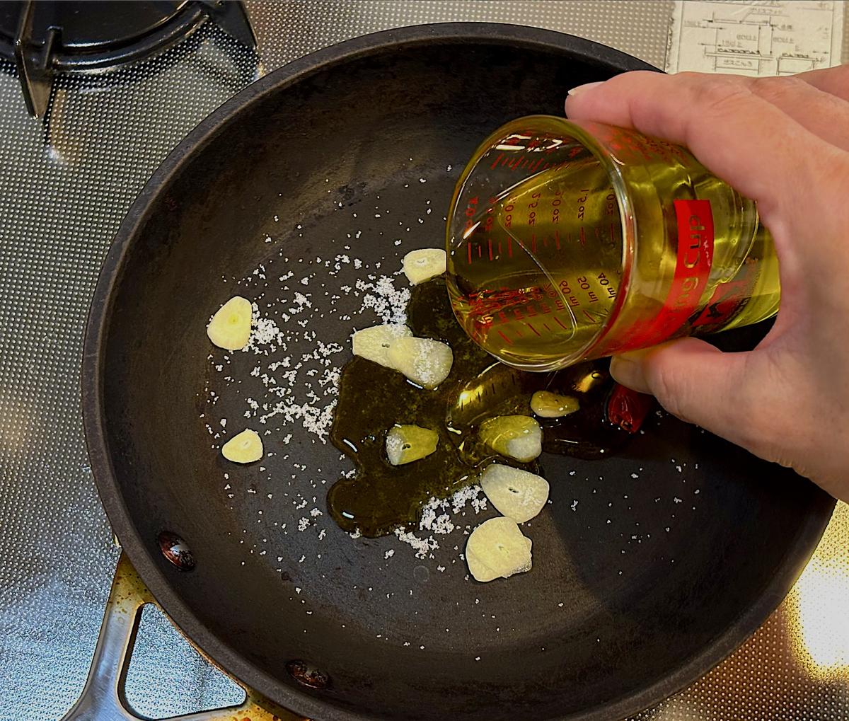 3. フライパンに唐辛子、塩、にんにく、オリーブオイルを入れ弱火であたためる。