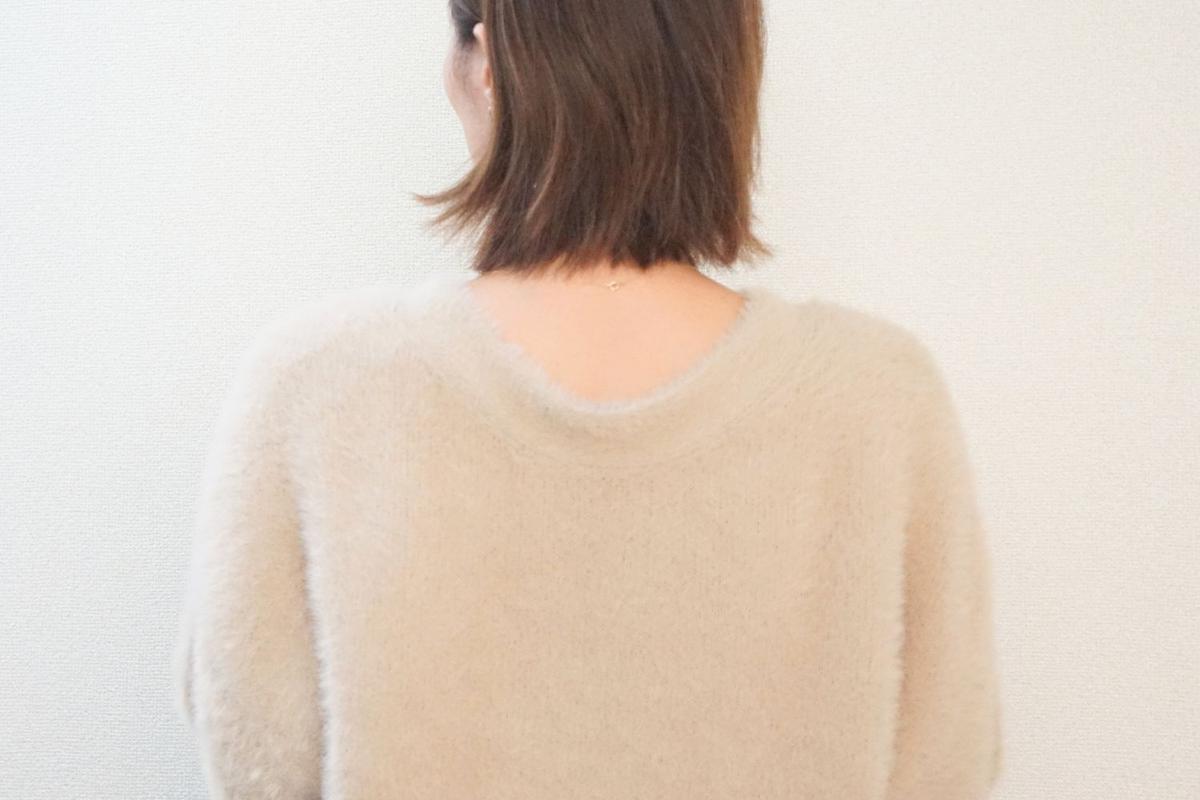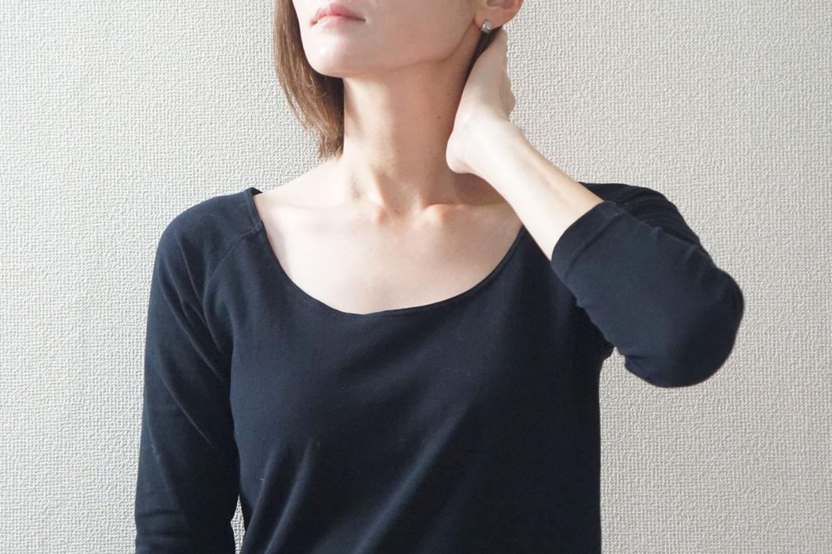 「あったかインナー」のバレエネックは襟ぐりが広く、襟を抜いて着るニットとも合わせやすい!