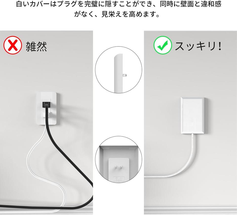 Mscienの「コンセントカバー」は、約148.2mm×95.2mm×19.5mmのホワイトカバーでプラグ全体を覆い隠し、壁面と違和感なく溶け込みます