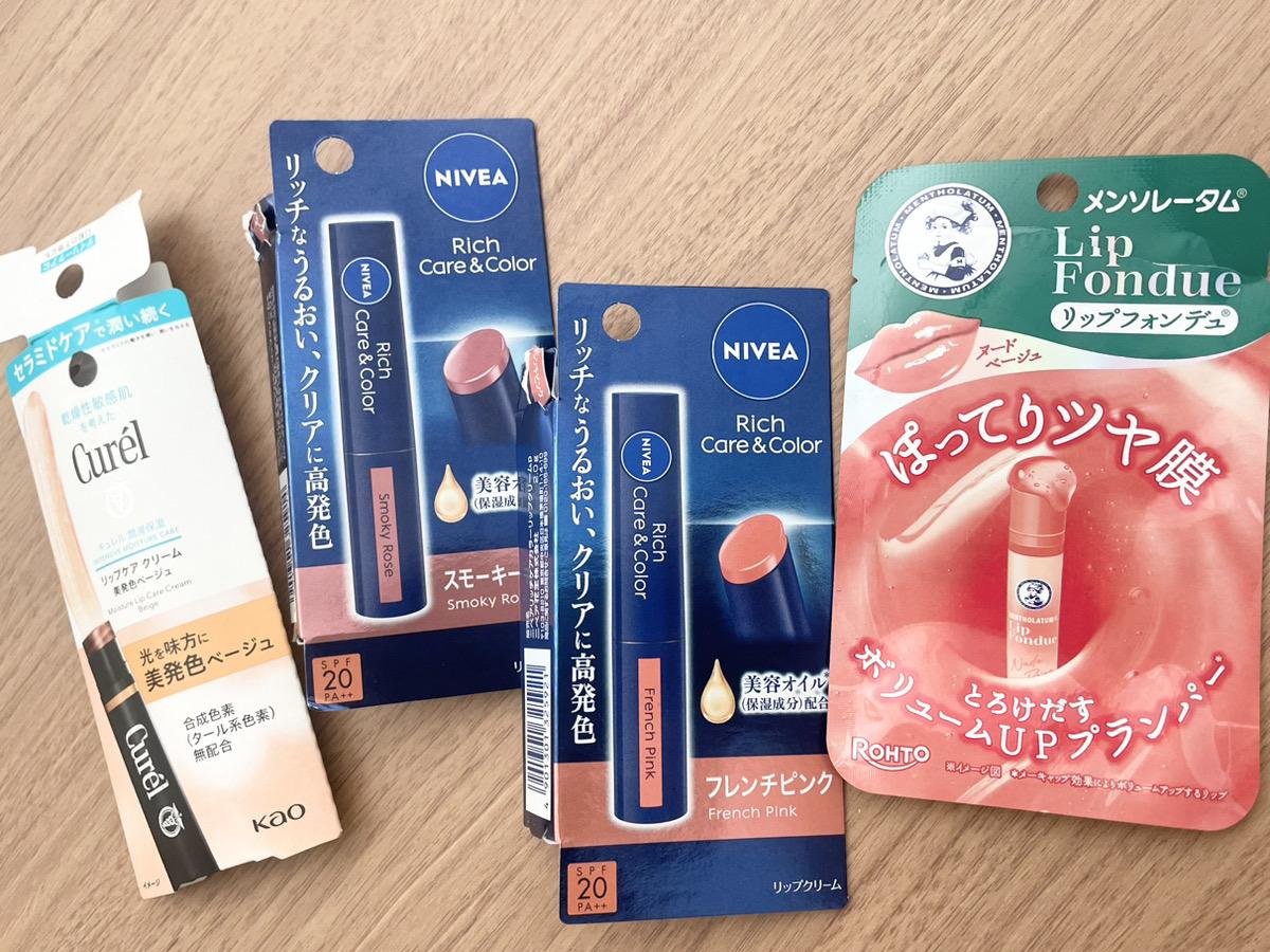 キュレルの「リップケア クリーム」を下地として忍ばせ、ニベアの「リッチケア&カラーリップ」で色をのせる。そこにメンソレータムの「リップフォンデュ」で艶を足す……といった具合に3つ使いを楽しんでいます。