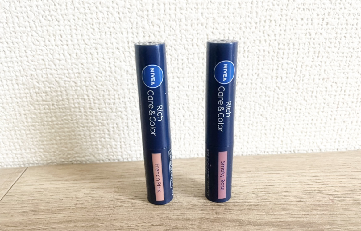 ニベアの「リッチケア&カラーリップ」のフレンチピンクとスモーキーローズ。あくまで体感ではありますが、スモーキーローズが人気のようだったので試してみることに。また、それに近しい色のフレンチピンクも一緒に購入してみました。