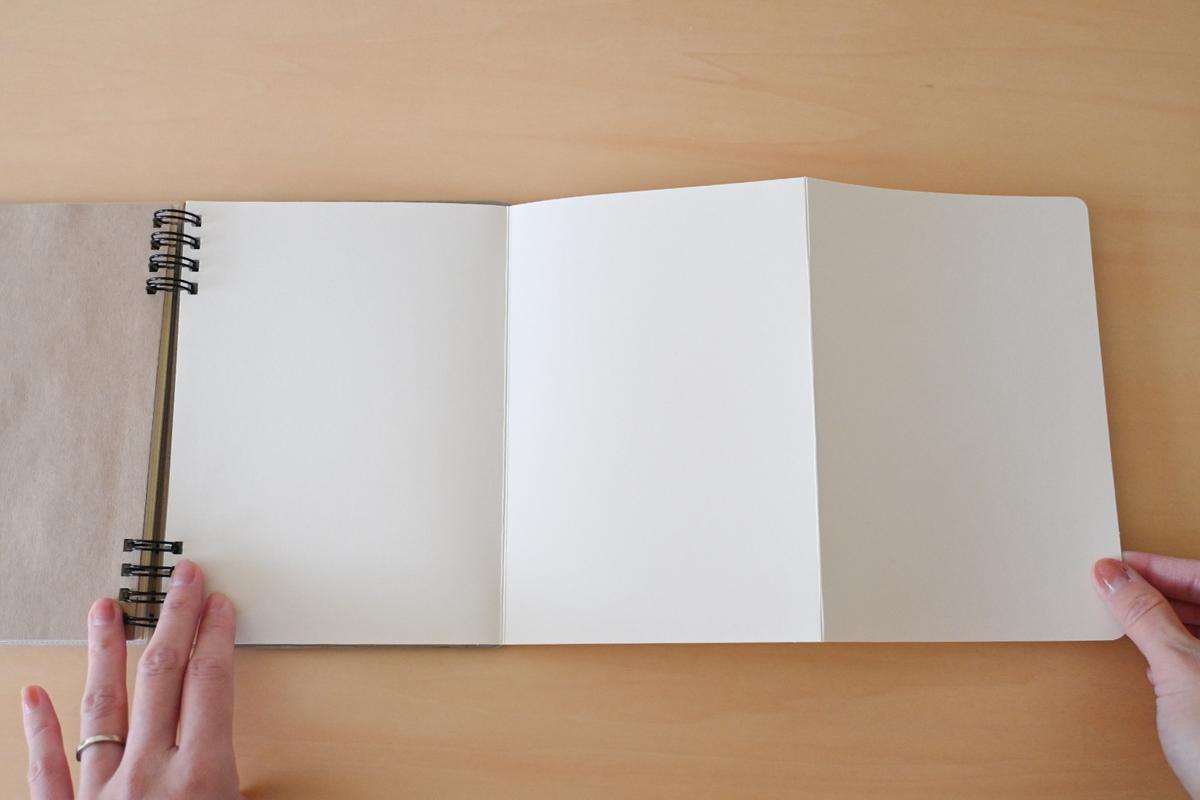 旅の振り返りとして思い出を広げて並べたり、普通のページには入らない地図やフライヤーなど大きいサイズのものを貼るのにも重宝しそう。