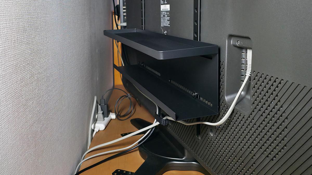 テレビ裏のネジ穴にねじ込んで固定するだけでカンタンに設置できるところが、「テレビ裏収納ラック」の良いところ。