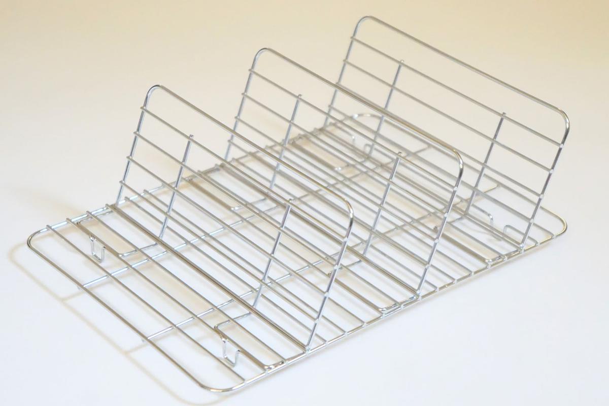 「揚げ物名人」は鉄クロームメッキ製。パーツは、「バット」「網」「立てる網」に分かれています。