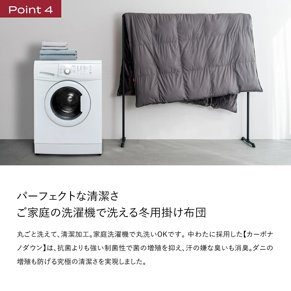 羽毛布団(高品質グースダウン)比で約196%の保温性を実現。中わたに採用された独自開発の「カーボナノダウン」により、微細な粒子を繊維内部に練り込み、暖かい空気をしっかり抱え込む構造に。