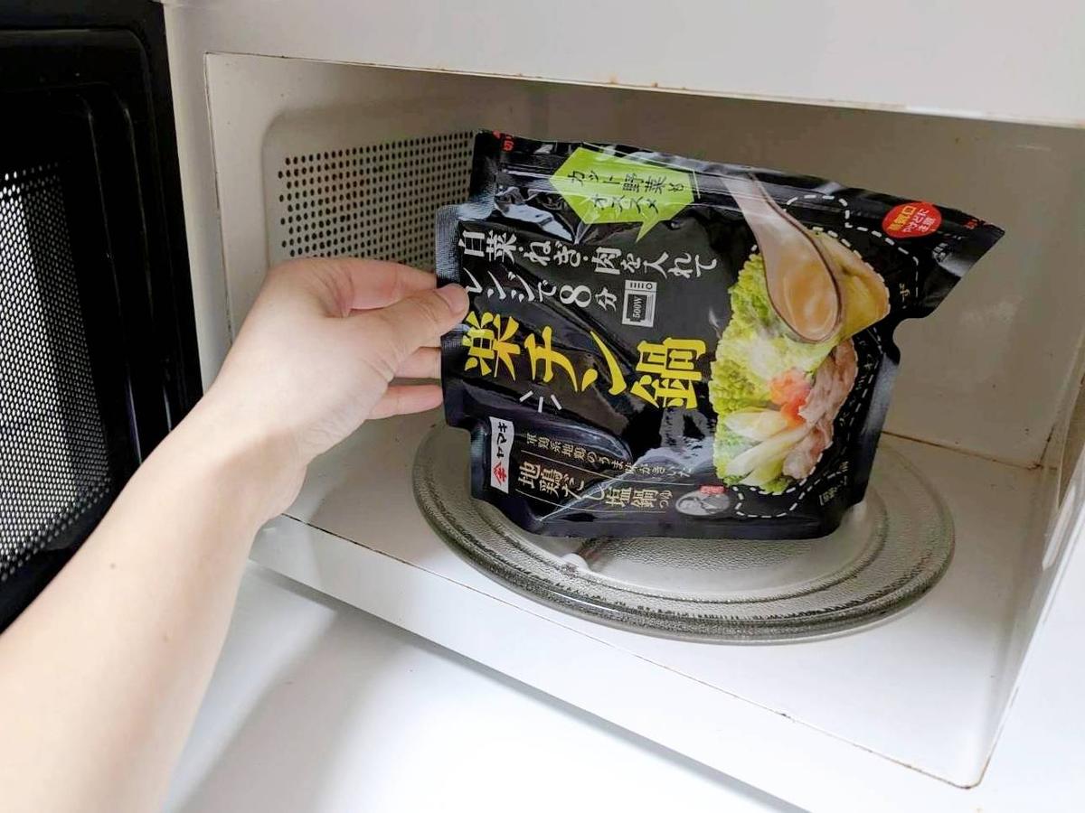チャックを完全にしめられたら、電子レンジ600Wで7分! 具材がパンパンに入っている状態だと、袋は安定して自立します。できあがるまで、お風呂掃除でもしながら待っているとちょうどいい感じ。