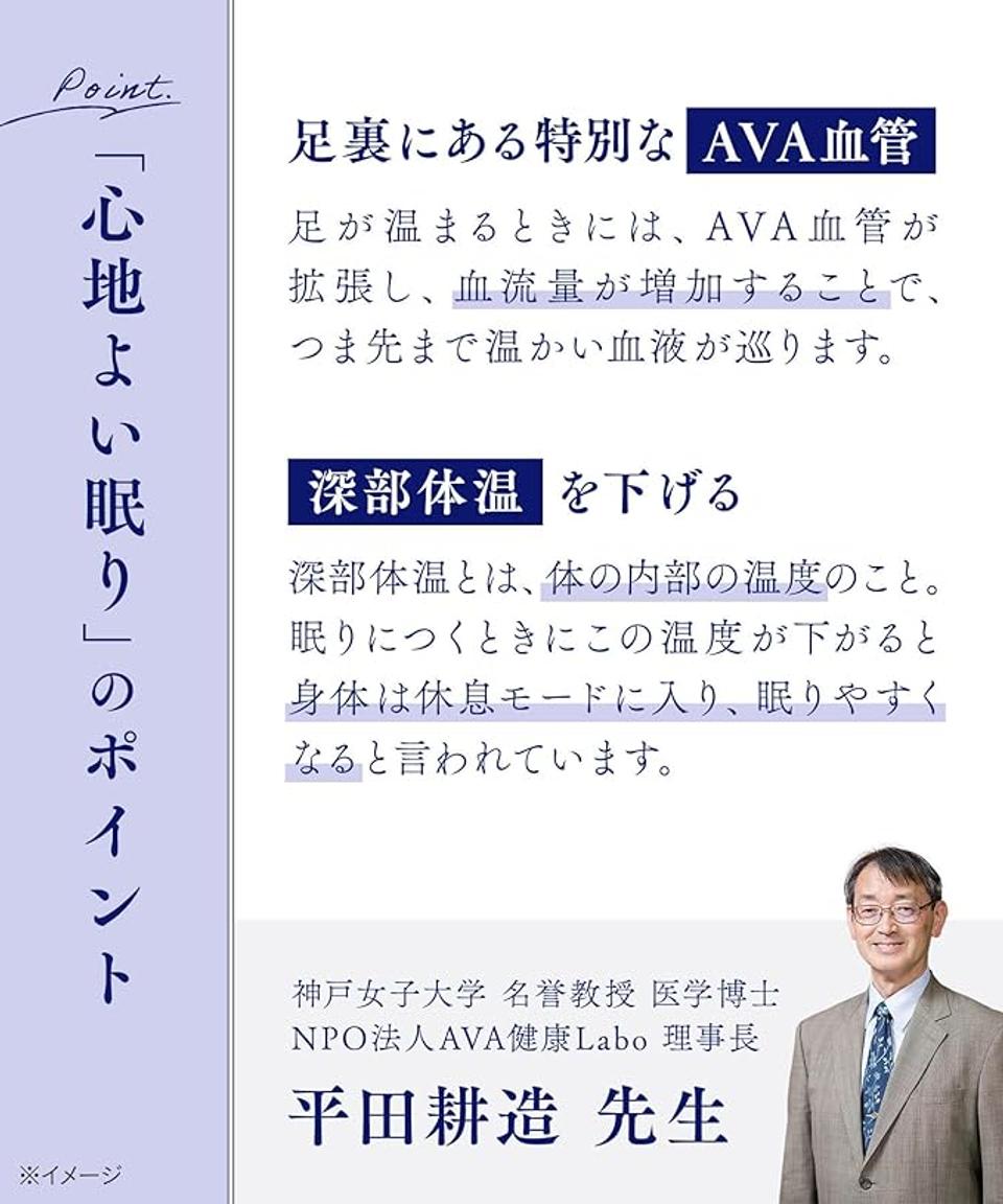 神戸女子大学名誉教授の平田耕造先生が監修。足が温まるとAVA血管が拡張し、血流量が増加することで、つま先まで温かい血液が巡ります。実は、眠りにつくときに「深部体温」が下がることが重要なんです!