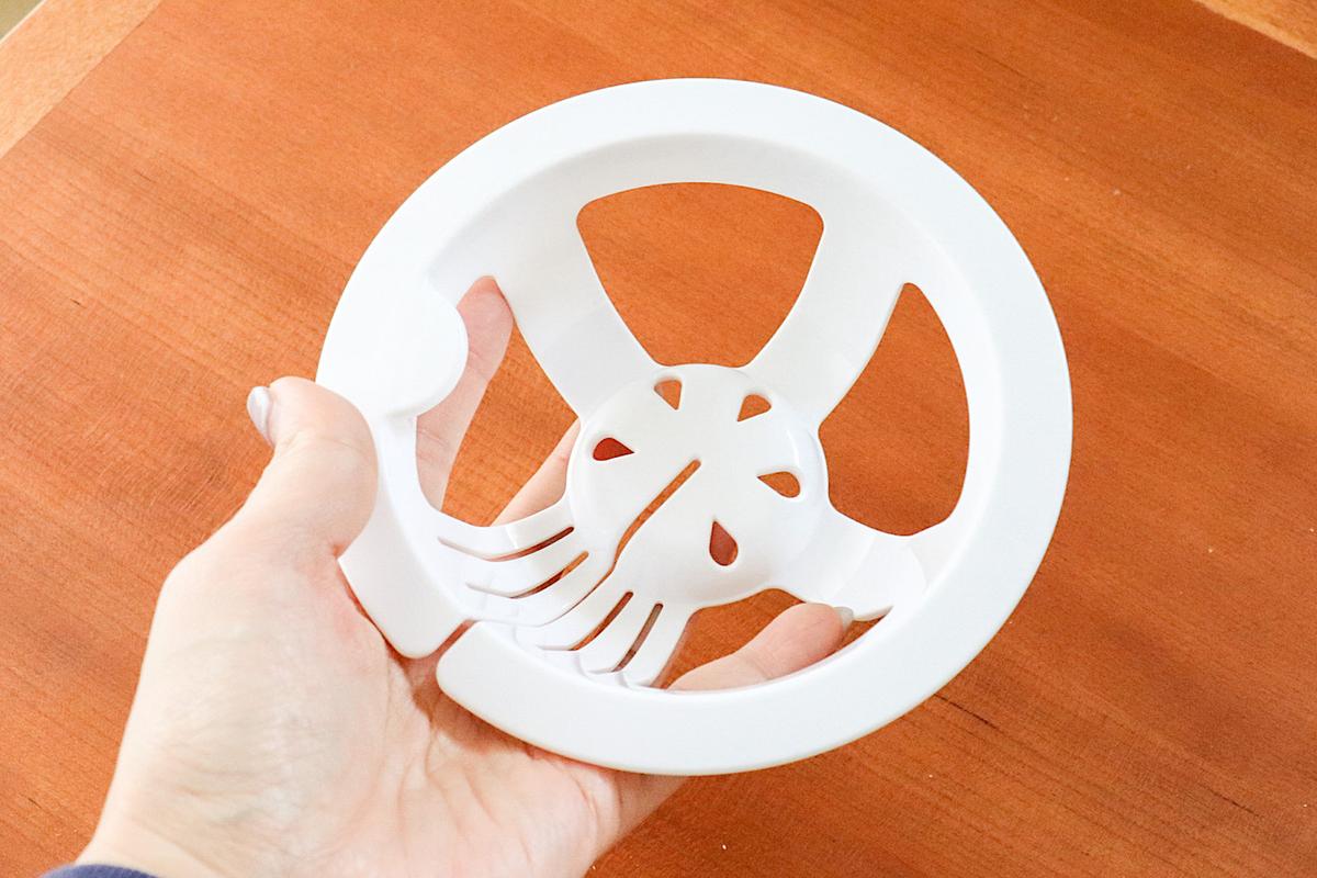 カゴの代わりにしては、かなり穴が大きめ。切り込みが入っている部分もあって、特徴的な形をしています。