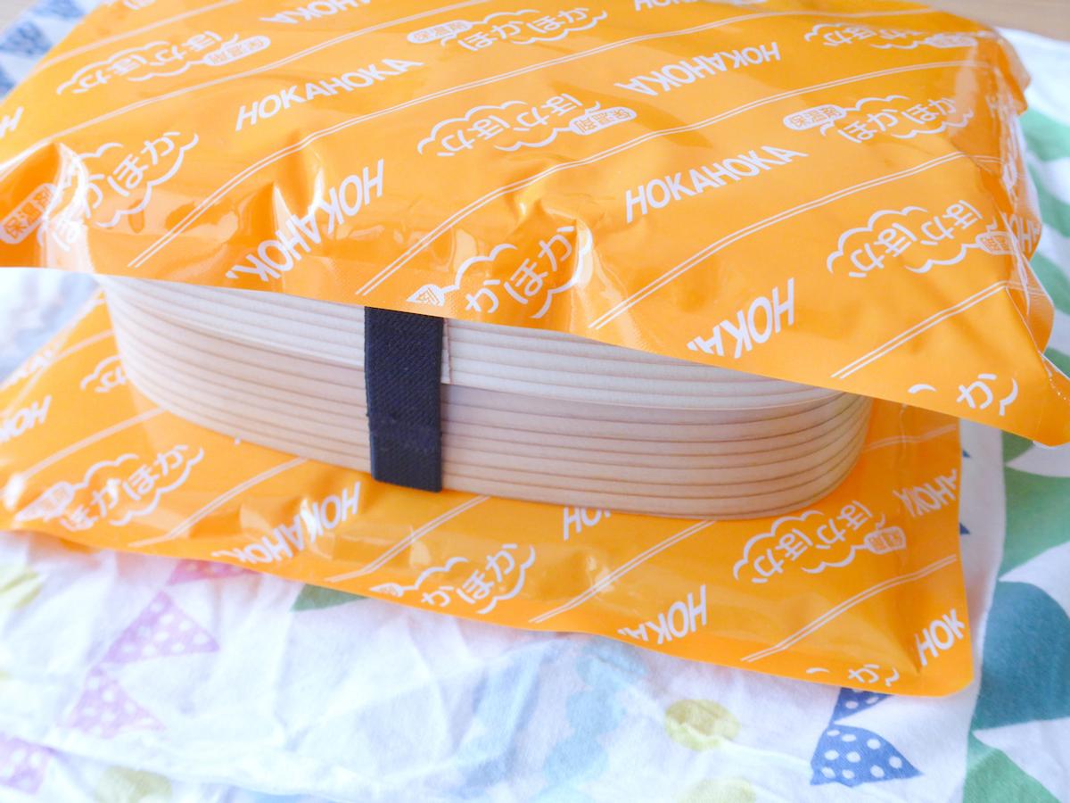 ひとつは電子レンジで温めた「ほかほかパック」を下に敷いて、手ぬぐいで包みます。