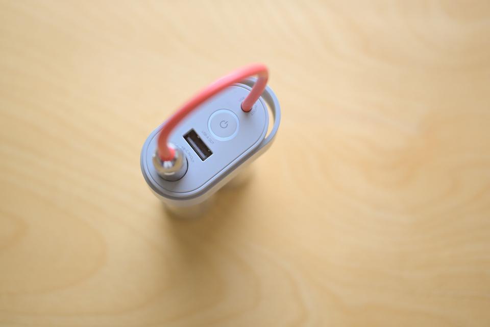 USB-AとUSB-Cの充電ポートが1つずつ、内蔵USB-Cケーブルが1つ、合計3つが備わっていて、3台のデバイスを同時充電できるという優れもの。