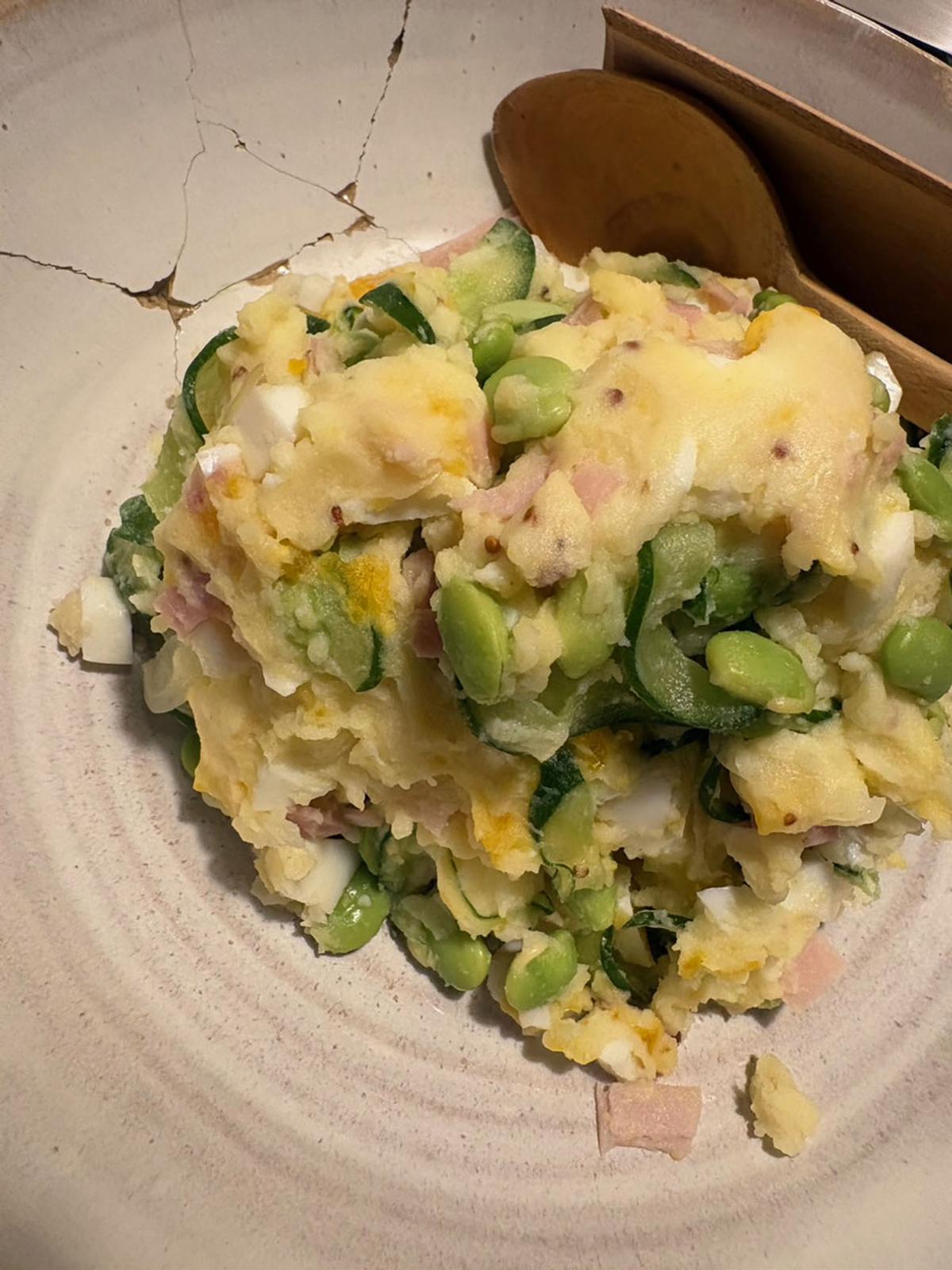 ポテトサラダ(じゃがいも6個)、白ごはん(3合炊いた)、茹で野菜のアレンジ(以上私の担当)。