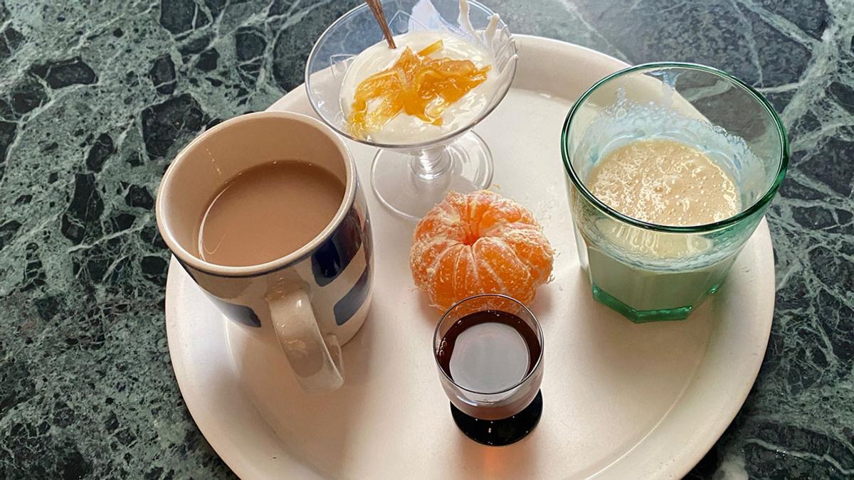 TORUくん、風邪続行中。プロテイン、ヨーグルト(マーマレード)、ミルクティ。「タンパク質の摂取が足りない!」と外科医の先生に言われたので、朝食にプロテインをプラスすることにした。