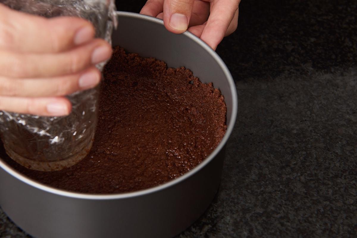3.型に2の7~8割を押し固めながら側面の高さが約2cmになるよう敷きつめ、冷蔵庫で冷やしておく。