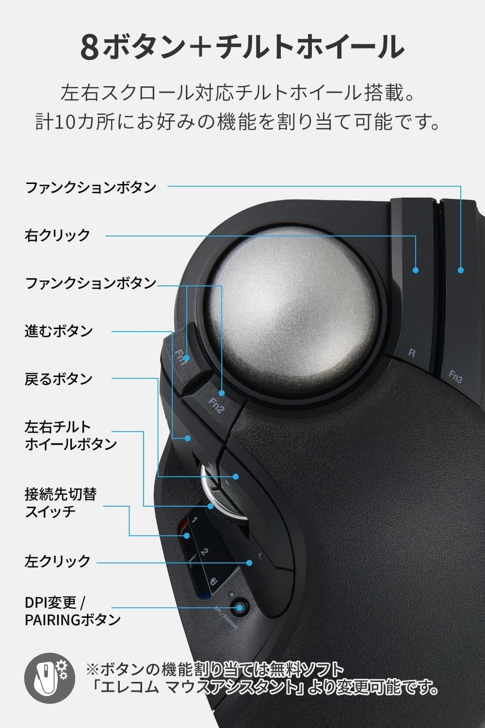 無料ソフトウェア「エレコム マウスアシスタント」をダウンロードすれば、8つのボタンと左右スクロールの2方向、合計10カ所にお好みの機能を割り当てることができます。