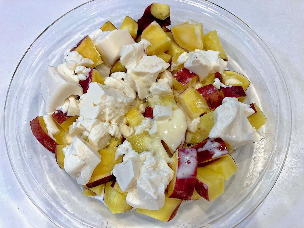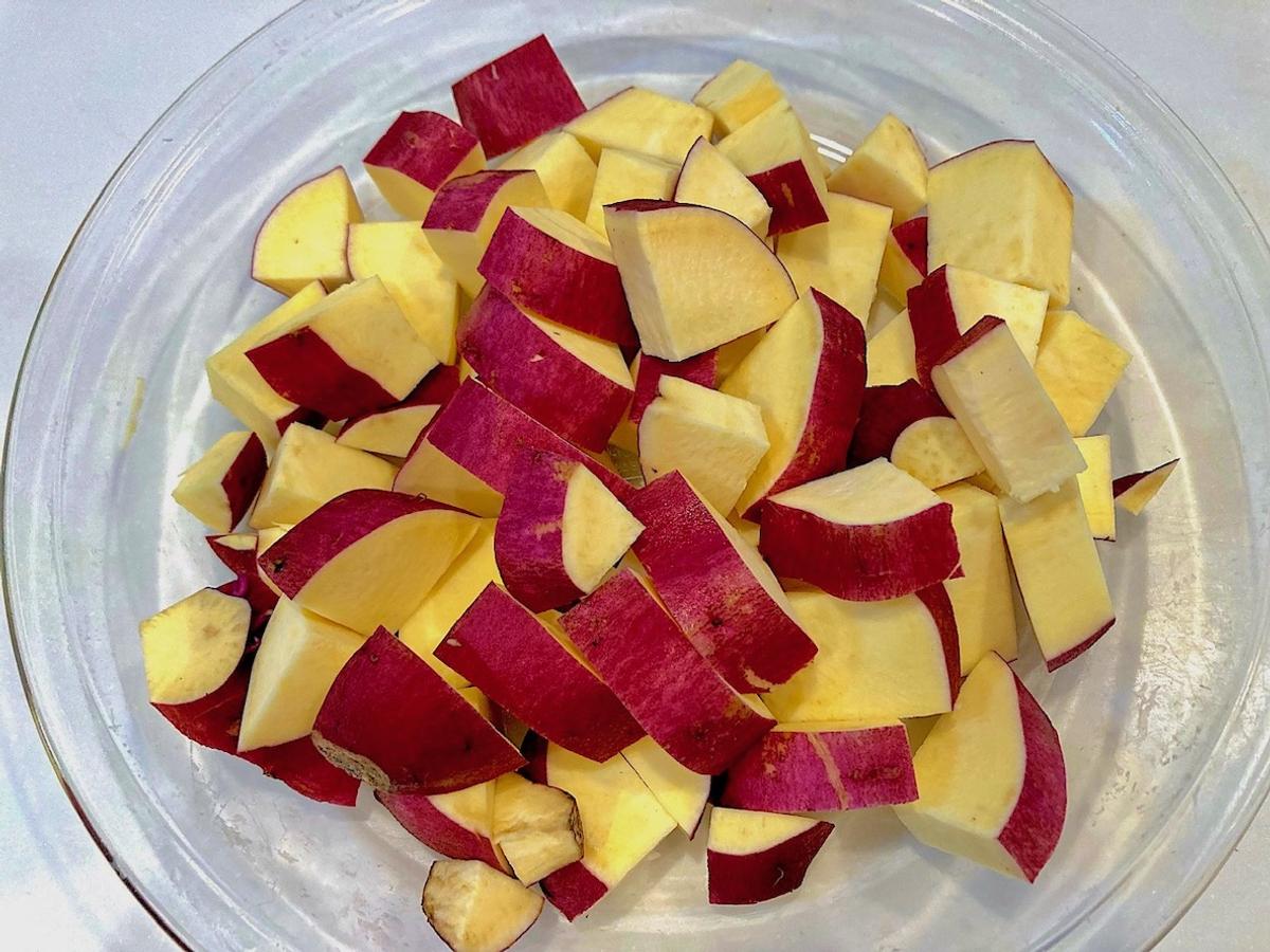 1. さつまいもをひと口大に切り、耐熱容器に入れる。ラップをかけて600wの電子レンジで5分加熱する。