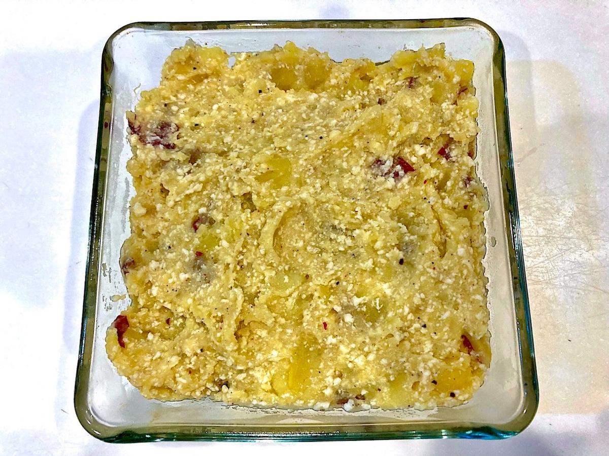 4. グラタン皿に薄くオリーブオイルを塗り、マッシュしたさつまいもを入れてペッパーを振る。ピザ用チーズをのせて、トースターでチーズに焼き色がつくまで焼く。