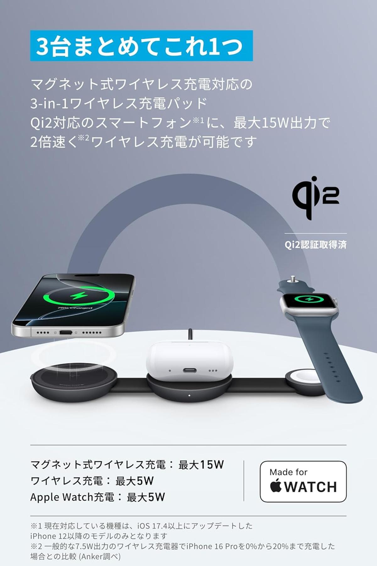Qi2対応で最大15W。3台同時充電も快適