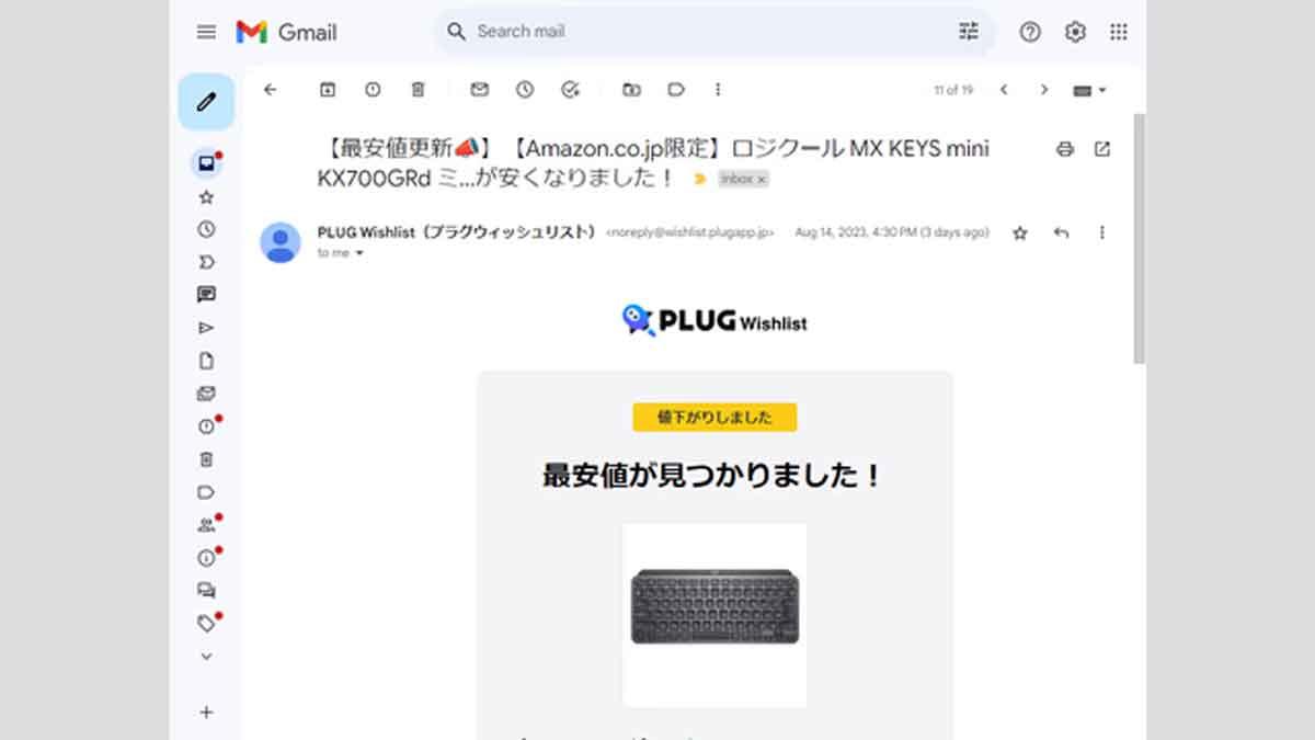 登録時より価格が下がったら、「PLUG Wishlist」からメールが届きます。