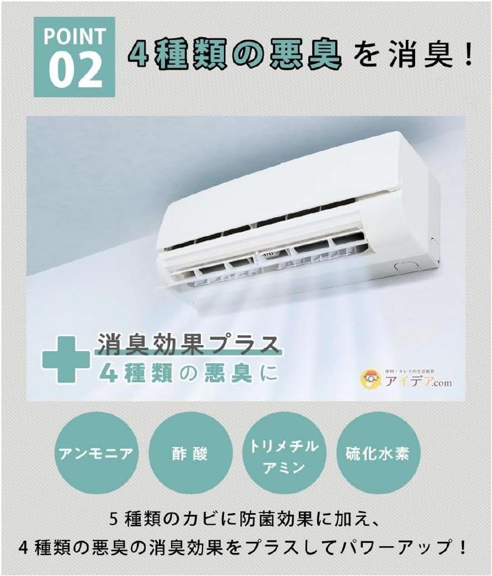 消臭効果もあるので、エアコンから出る嫌なニオイともサヨナラできます。日本製で安心感もバッチリですよ。