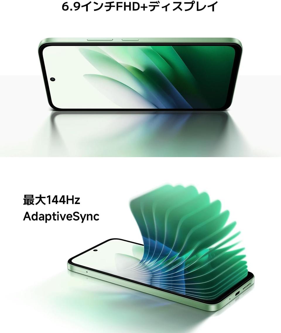 ディスプレイは6.9インチFHDの大画面仕様。シーンに応じてリフレッシュレートを自動調整する最大144Hz駆動により、動画視聴やスクロール時も滑らかな表示を実現します。