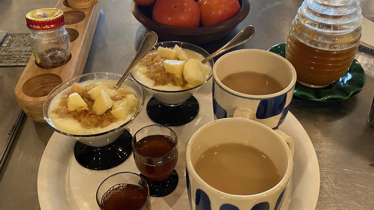 ヨーグルトの上にすりおろしたりんごと角切りのりんご。美味しい。今日の元気、ミルクティ。