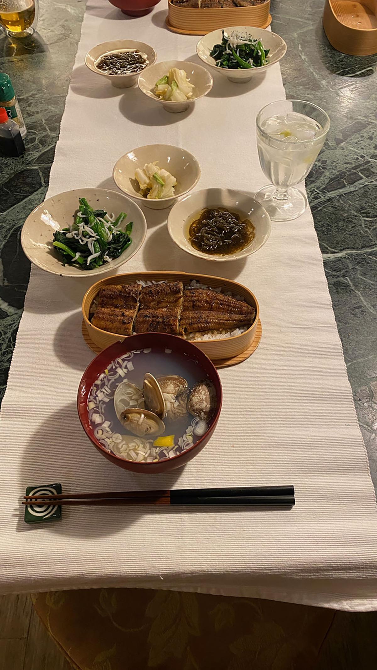 なんとナイスなタイミング。実家から宮崎県西都市「入船」の蒲焼も届きました。5種類の漬物の中から白菜漬けをいただきます。今夜は鰻重とアサリのお吸い物とほうれん草とシラスあえともずくと白菜漬けという献立。スッキリ、はっきりした美味しさを満喫。