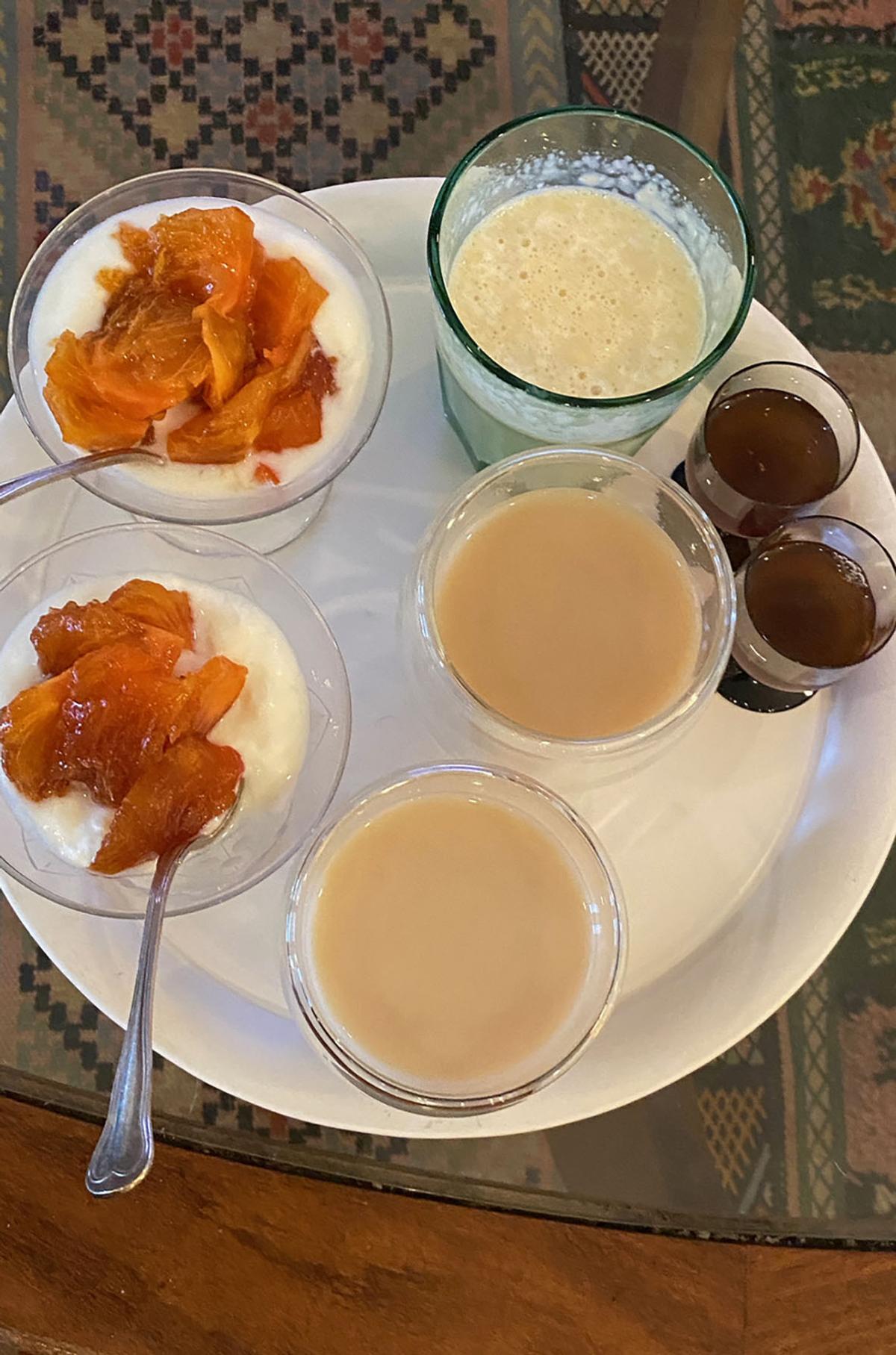 ヨーグルトの上に熟しすぎた柿をのせて。プロテイン、今日の元気、ミルクティ。