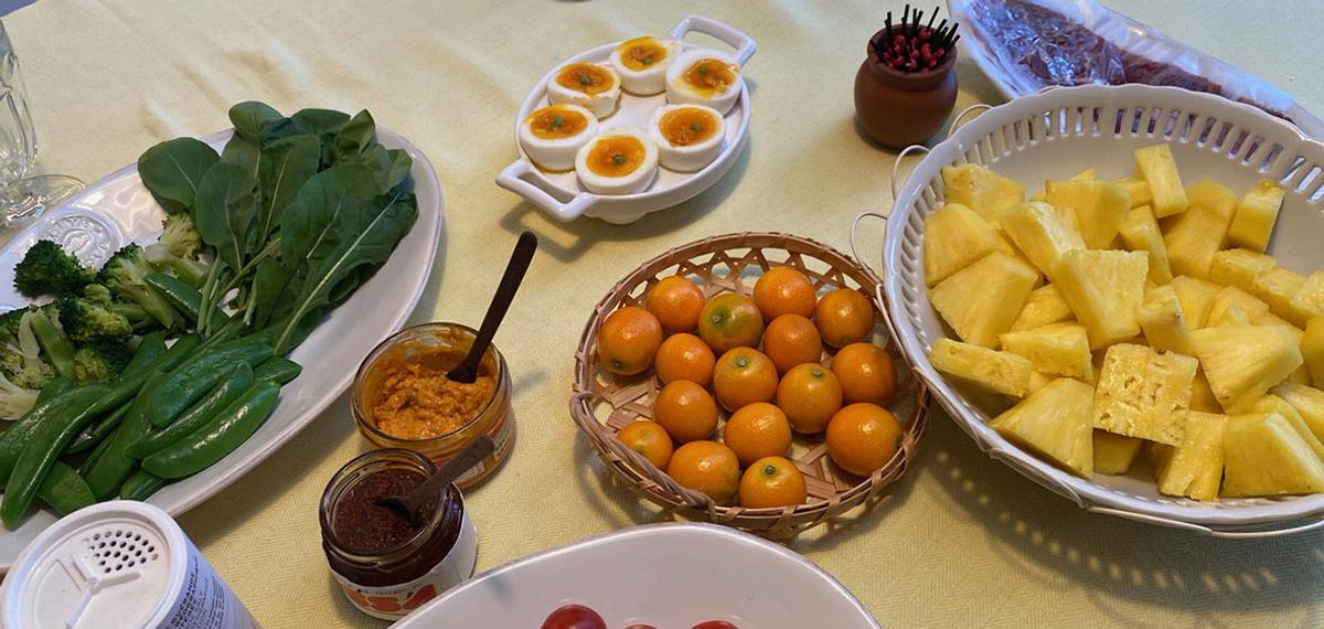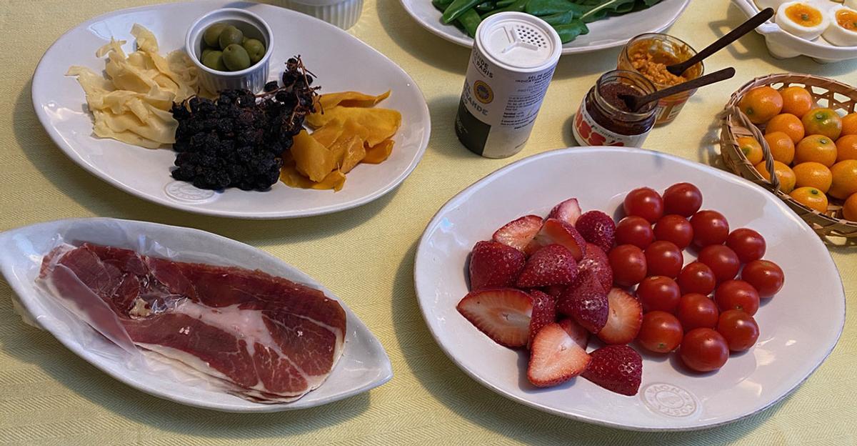 イベリコハム、チーズとレーズンとマンゴー、イチゴとミニトマト(赤)、半熟卵(白&黄)、パイナップル(黄)、金柑(黄)ルッコラとスナップエンドウとブロッコリ(緑)、