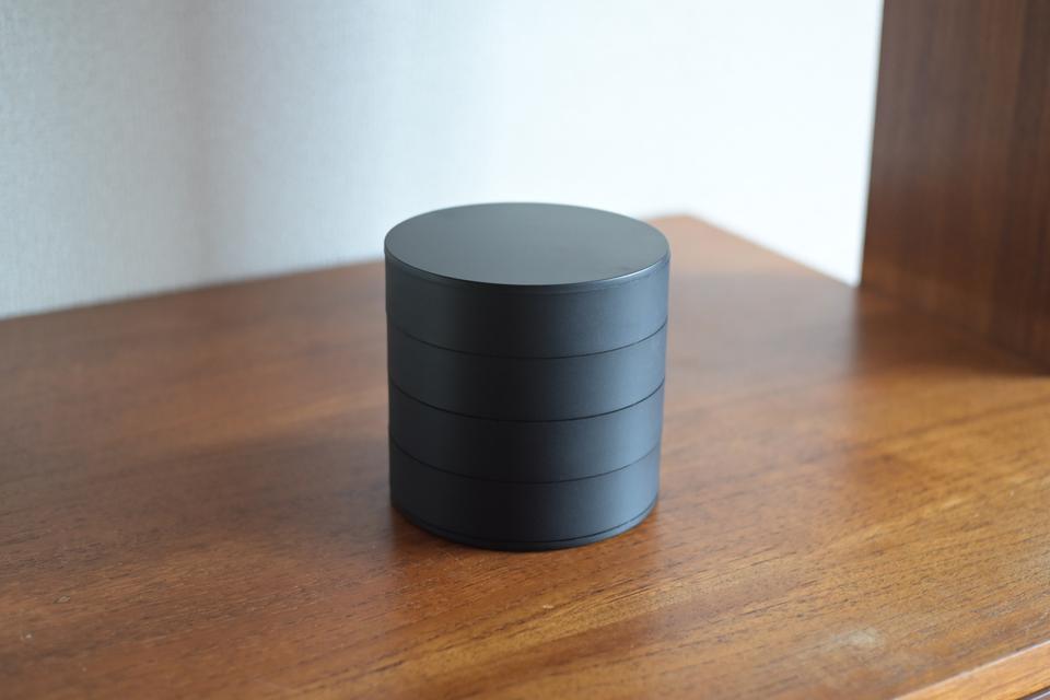 「蓋付き 4段 アクセサリートレー」は全部のトレーをしまうと、直径10cm×高さ10cmのコンパクトな円柱形になります。