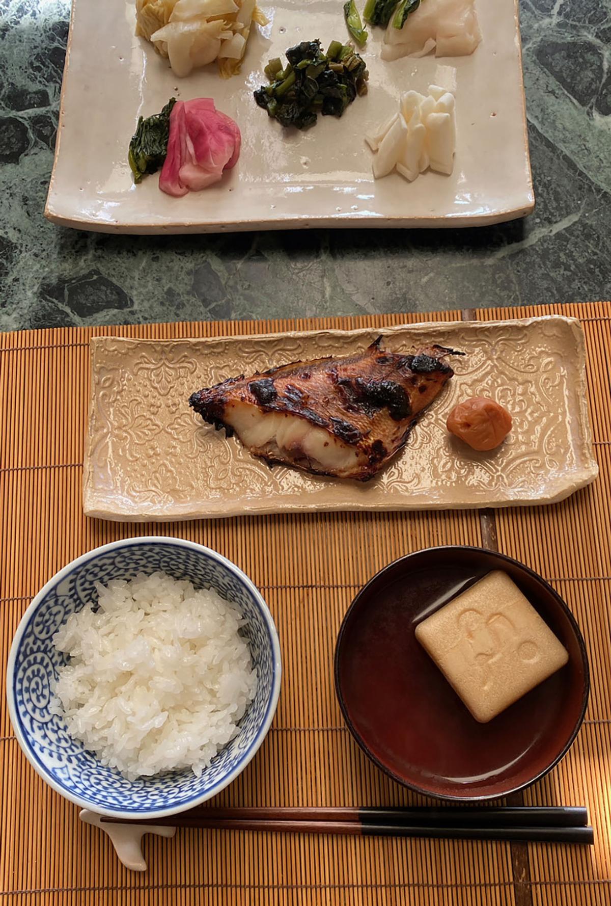 京都つけもの5種、目抜きの粕漬け、ごはん(つや姫美味しい)、加賀麩(不室屋)のお吸い物。