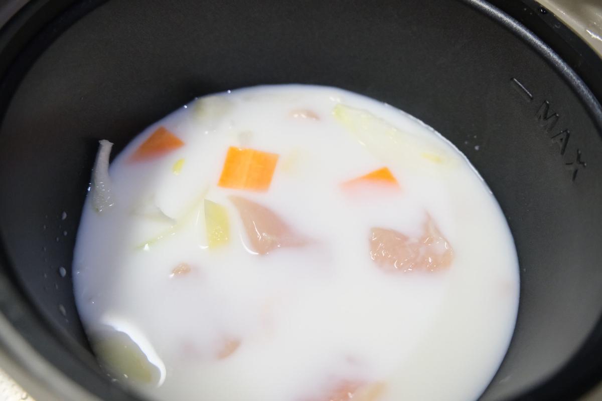 まずは、刻んだニンジンや玉ねぎ、鶏肉など、ルー以外の材料をすべて入れて、電子レンジ(600W)で9分加熱。