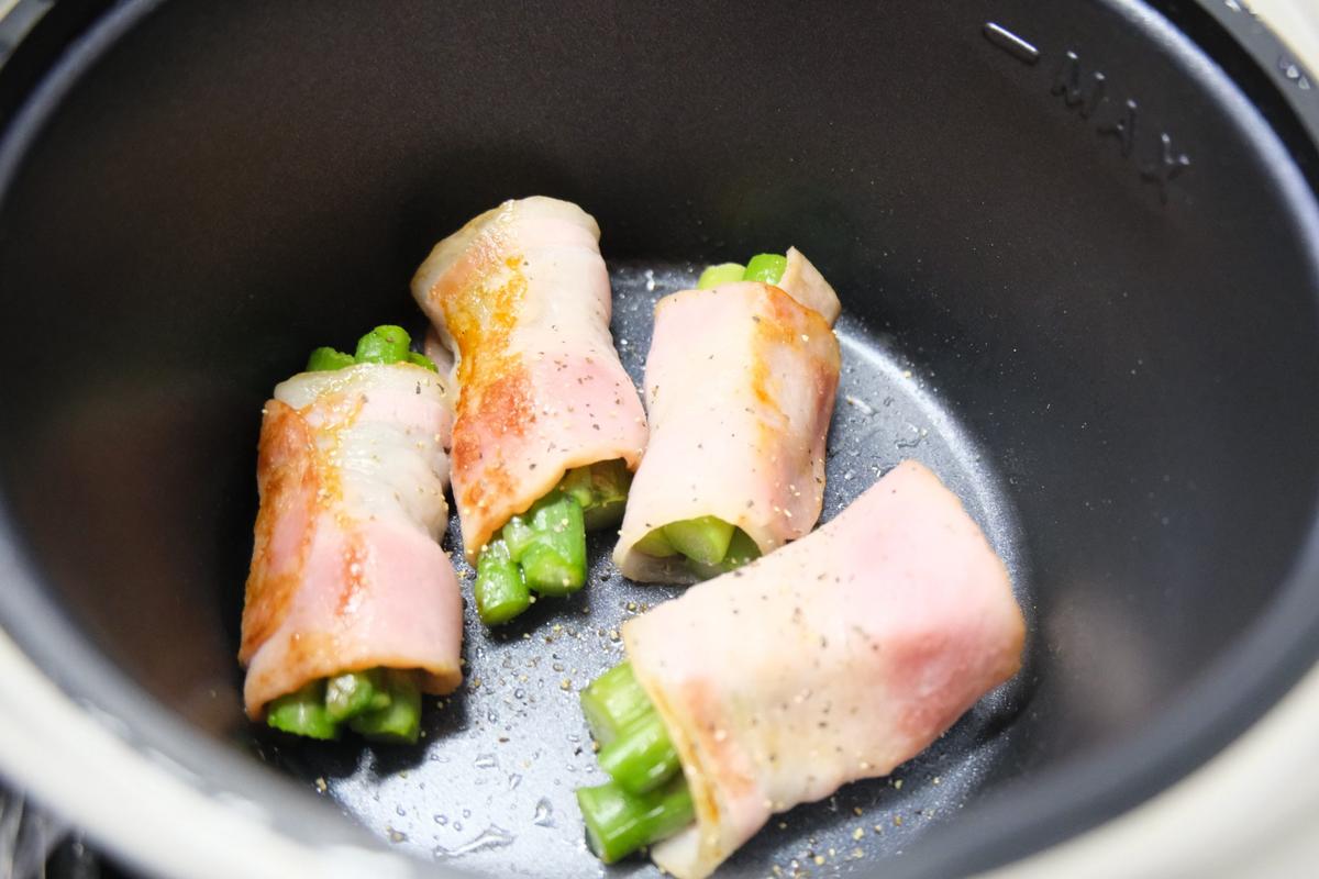 容器に少量の油を敷き、アスパラベーコンを並べて電子レンジ(600W)で5分加熱します。