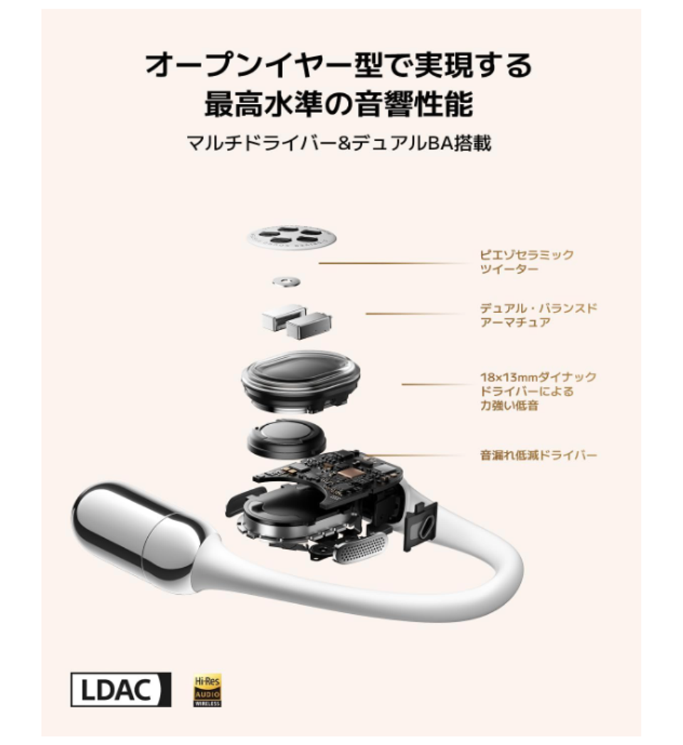 イヤーフック部分には柔らかい液体シリコン+形状記憶チタンワイヤーを採用し、耳にしっかりフィットしながら圧迫感を抑える設計となっています。