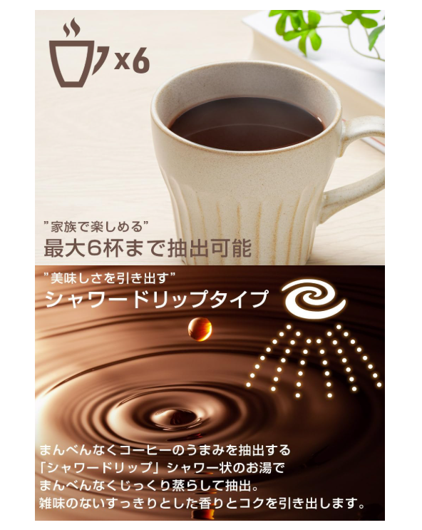 粉をしっかり膨らませて旨みを引き出す「深リブフィルター」と、シャワー状にお湯を注ぐ「シャワードリップ」方式により、コーヒー粉全体をじっくり蒸らしながら抽出し、雑味が少なく香り高いコーヒーが楽しめます。