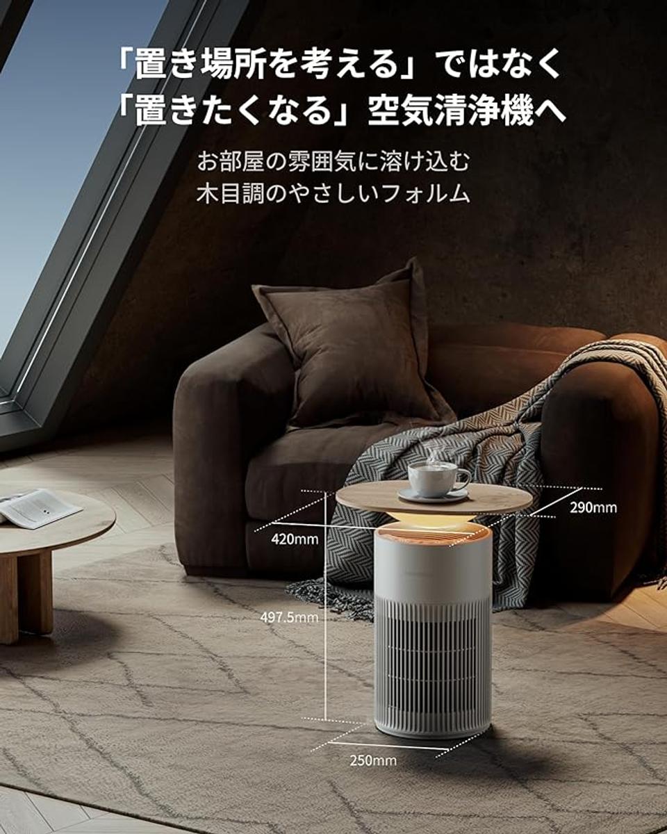 なんとこれ、空気清浄機・ムードライト・ワイヤレス充電器・サイドテーブルの4役を1台でこなしちゃうんです! 天板は防水仕様なので、飲み物を置いても安心。スマホを置くだけで充電もできて、ケーブルのゴチャゴチャから解放されますよ。